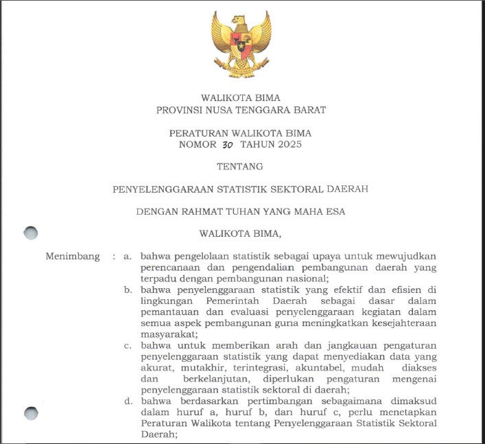 PERATURAN WALIKOTA BIMA NOMOR 30 TAHUN 2025 TENTANG PENYELENGGARAAN STATISTIK SEKTORAL DAERAH